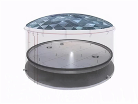 全接液内浮盘指内浮盘本体漂浮在液体中有一定的浸液高度,浮力单元之间及与各部件的连接部位有可靠的密封措施,形成底部全域浸入液体的内浮盘。全浸液内浮盘包括箱体式、浮舱式、玻璃钢复合材料式、全焊接蜂巢芯式及其他形式的装配式全浸液内浮顶。全接液内浮盘适用于储罐内直径5m~48m。